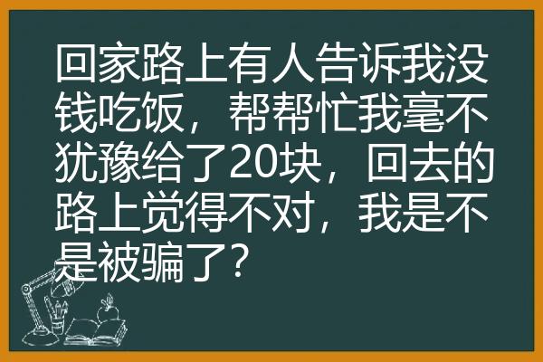 言归正传,题主问:回家路上有人告诉我没钱吃饭,帮帮忙,我毫不犹豫给了20块钱,回去的路觉得不对,我是不是被骗了?