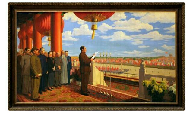 《开国大典》写实描绘了1949年10月1日在天安门广场举行的中华人民共和国成立的盛大庆典,毛泽东主席在天安门城楼上宣告中华人民共和国成立的那一刻。画面中有时任11位领导人入画,人民政府主席:毛泽东,副主席:朱德、刘少奇、宋庆龄、李济深、张澜、高岗,政务院总理:周恩来,副总理:董必武、郭沫若,秘书长:林伯渠。