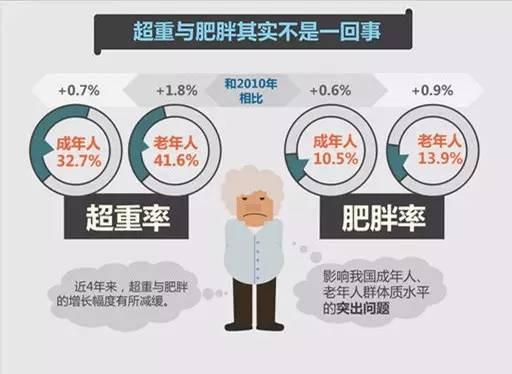 此次监测的三大类内容,身体形态指数是唯一出现下滑的指数。数据显示,2014年成年人和老年人的超重率分别为32.7%和41.6%,比2010年分别增长0.6和1.8个百分点;成年人和老年人的肥胖率分别为10.5%和13.9%,比2010年分别增长0.6和0.9个百分点。