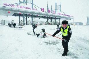 但是走到绥芬河/镜泊湖/G11方向时,突然前方车辆不动了,开始堵车。老公下车查看,前面的司机朋友说,前面有管理局工人们在清理结冰的路面,需要一段时间。