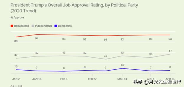 第一,特朗普支持率创新高,只是一个时间差内的假象对于特朗普支持率创新高,这恐怕只是在一个时间差内的假象。根据4月30日,美国著名民意调查机构盖洛普发布了一则数据。数据表明,4月14日至28日的调查中,美国民众对特朗普的支持率,居然达到了其任期内的最高水平。