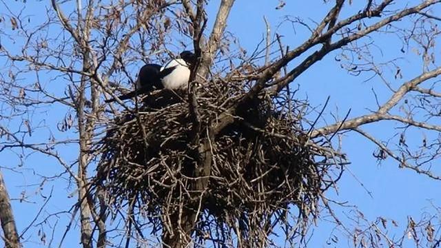 第二:筑巢。喜鹊筑巢(北方)通常是在每年的冬天十一二月份的时候,筑巢时喜鹊夫妻双方共同完成的,在选好筑巢点之后,喜鹊夫妇会先去衔来一些较粗大的树枝,从底部开始铺设,在铺设时,也是有规律的,树枝纵横交错,彼此之间都吃上力,而且最关键的是总是有一些树枝是别在树木本身的三根大树枝上的,虽然喜鹊没有把衔来的树枝绑在上面,但是这种方式也能让所有的树枝都均匀的受力,而且树木本身的树枝也是受力点。