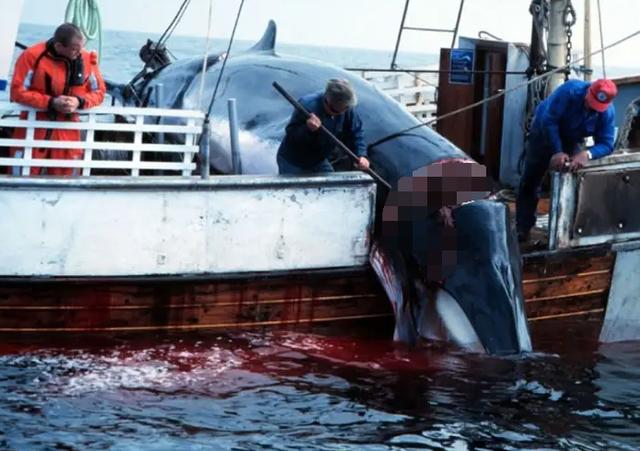2009年,一部《海豚湾》的纪录片,记录了日本捕杀海豚时的血腥场面,而捕鲸和这个非常类似,鲸鱼身体在不断的流血,整个海面都被染成血红色。