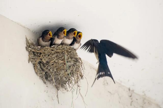 雏燕孵化后,就来到了成燕最忙碌的阶段了,由于燕子是夫妻共同抚养后代的,所以在孵化期,它们夫妻通常会“倒班”,孵化出来以后就会两两的一起出动觅食了。