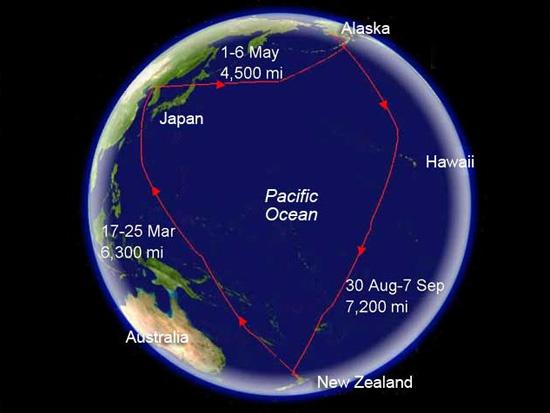 可见,鸟儿虽然不大,但是对于飞行这件事,它们可是高手。那么,在自然界中,谁是飞得最高的鸟呢?我们一起来揭秘一下。(下图为斑尾塍鹬的飞行路线)