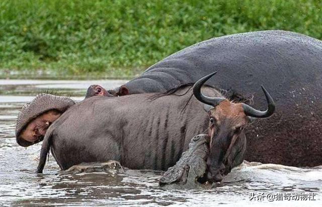 是河马。至于旁边的角马无动于衷,是食草动物的迟钝与悲哀。