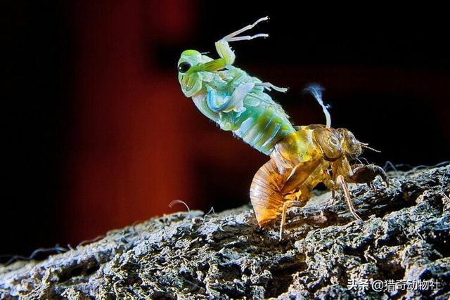 之后,金蝉会在6-7月份的雨后的傍晚,悄悄地从地下爬出来。它们判断这个时机也是有依据的。首先是地温,到了6-7月份,地温非常的高,金蝉进入浅层,然后将地面用前肢戳一个很小的孔。根据孔内进入的光线和湿气来判断夜晚和雨后。因为,这种环境下出土,是最有利于金蝉的最后一次蜕皮的。