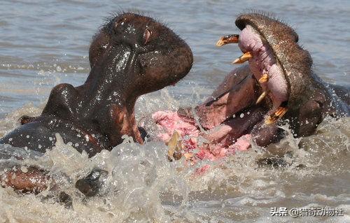 河马是群居动物,它们有着极强的领地意识,对于入侵领地的动物,除了大象以外,它们向来是毫不客气,河马有着一张800公斤咬合力的大嘴,在配和上它平均60公分的牙齿,就算是“水中霸主”鳄鱼见到河马也得绕道而行。