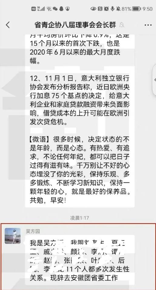 近日,一个姓吴的美女在网上爆料,有名有姓地炫耀自己与11个男子多次发生性关系,一时间引起一片哗然,也把安徽青企协推到了风口浪尖。
