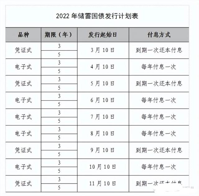今年我国储蓄式国债发行计划,大概是总共发行9期储蓄式国债,发行时间从2022年3月10日开始发行,基本上一个月一期,最后一期储蓄式国债是在11月10日发行。这样一来,喜欢国债投资的朋友们,可以计划好时间,然后提前咨询好银行营业厅,到发行的时候去指定的14家国债承销银行购买就可以了。