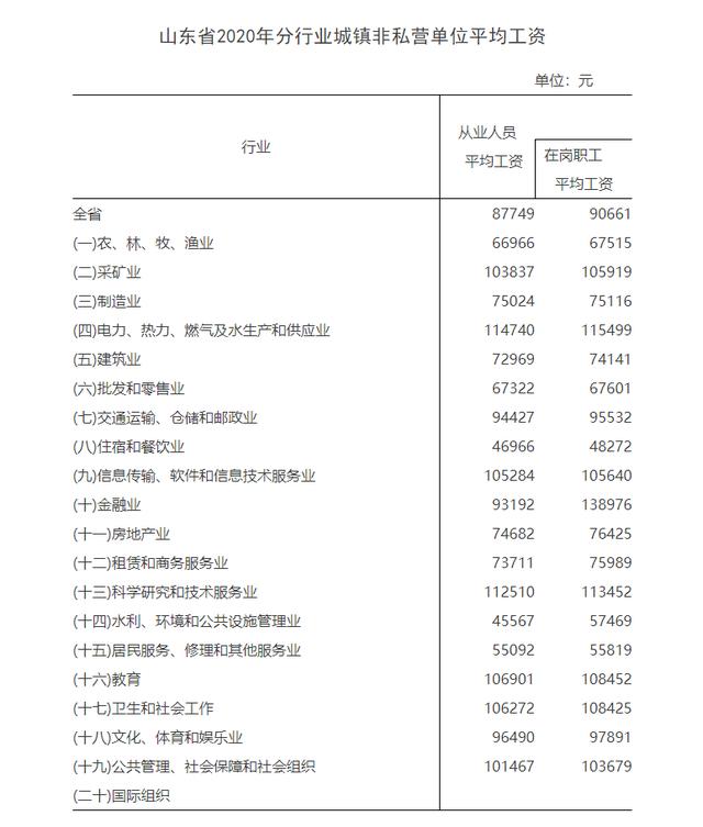 当然具体到不同的行业上面,工资水平是不一样的,从山东省统计局公布的数据来看,年平均工资最高的是电力、热力、燃气及水生产供应业,其年平均工资达到122,998元,月均工资是10250元左右;