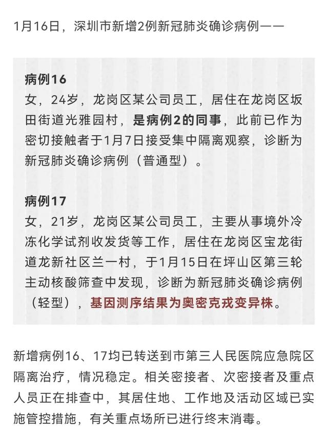 深圳在1月16日新增2例新冠确诊病例,均为年轻女子,一个24岁,另一个21岁,两人同在龙岗区某公司就职。