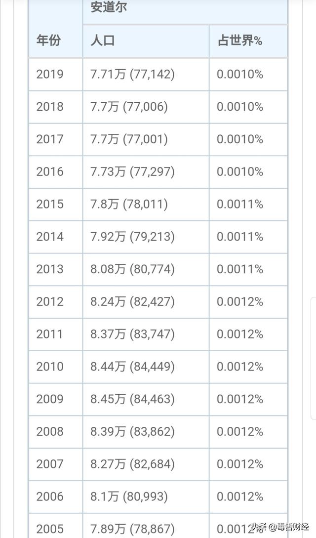 2、人口数量:截止2019年末,按照人口数量只有7.71万人,这个人口数量也跟我国一个稍微大一点的镇差不多,这说明微信上2,000万“安道人”绝大多数都是虚假的。