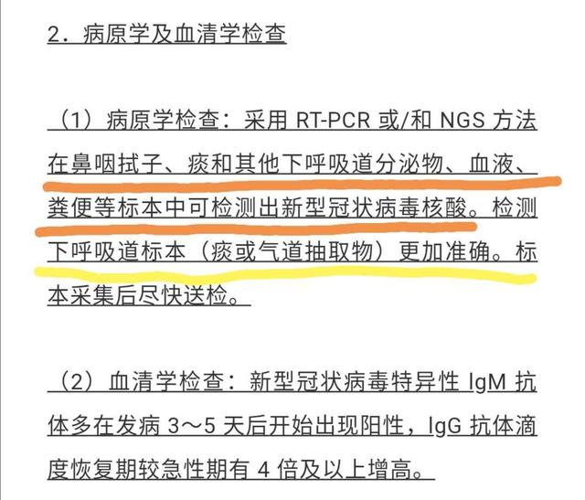 在诊疗指南第七版中,也明确指出,通过对患者的鼻咽拭子、痰液、下呼吸道分泌物、血液、粪便等标本进行病原体检查,如果能够检测到新型冠状病毒核酸阳性,都可以确认新型冠状病毒的感染。而由于新型冠状病毒主要感染方式是通过病毒与病人的呼吸道上皮细胞结合而感染,因此,采用呼吸道采样,特别是下呼吸道采样标本进行检查,在采样后尽快检测,其检测准确度更高。