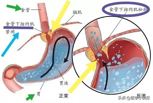 而所谓的胃食管反流病,实际上就是上图中的“门”坏了,守卫胃的贲门,食管下括约肌松弛了,这胃里的食物、胃酸等向食管方向反流而上,大家都知道,这尤其是胃酸,酸性特别强,会对我们的食管、咽喉等处造成刺激,从而引发食管炎、咽喉炎,甚至严重者,还会造成食管溃疡,从而导致胃食管反流病的发生!