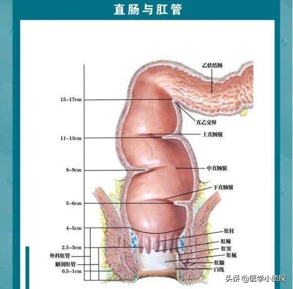 如图可见:直肠是位于我们大肠的最末段,与肛门直接相连的位置,临床上把直肠分为上、中、下三段,距离肛缘7cm以内为下段,7-10cm为中段,>10cm以上为上段。但是80%的直肠癌都发生于中下段,及距离肛缘10cm以内。所以,如果我们医生怀疑病人是直肠癌的话,都会要求进行肛门指检。