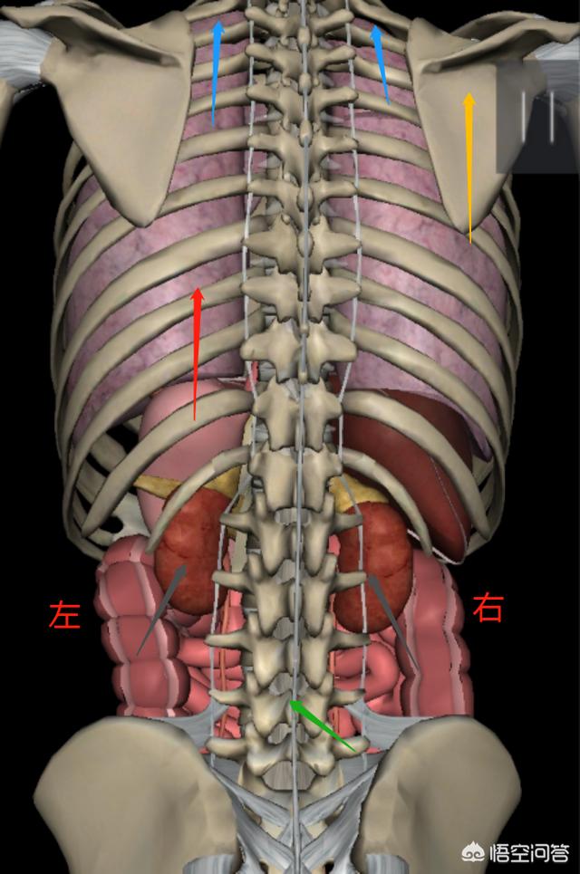 第五是肾结石等肾脏疾病引起的后背痛(灰色),通常右肾因肝脏原因要低于左肾位置,要注意区分排查。