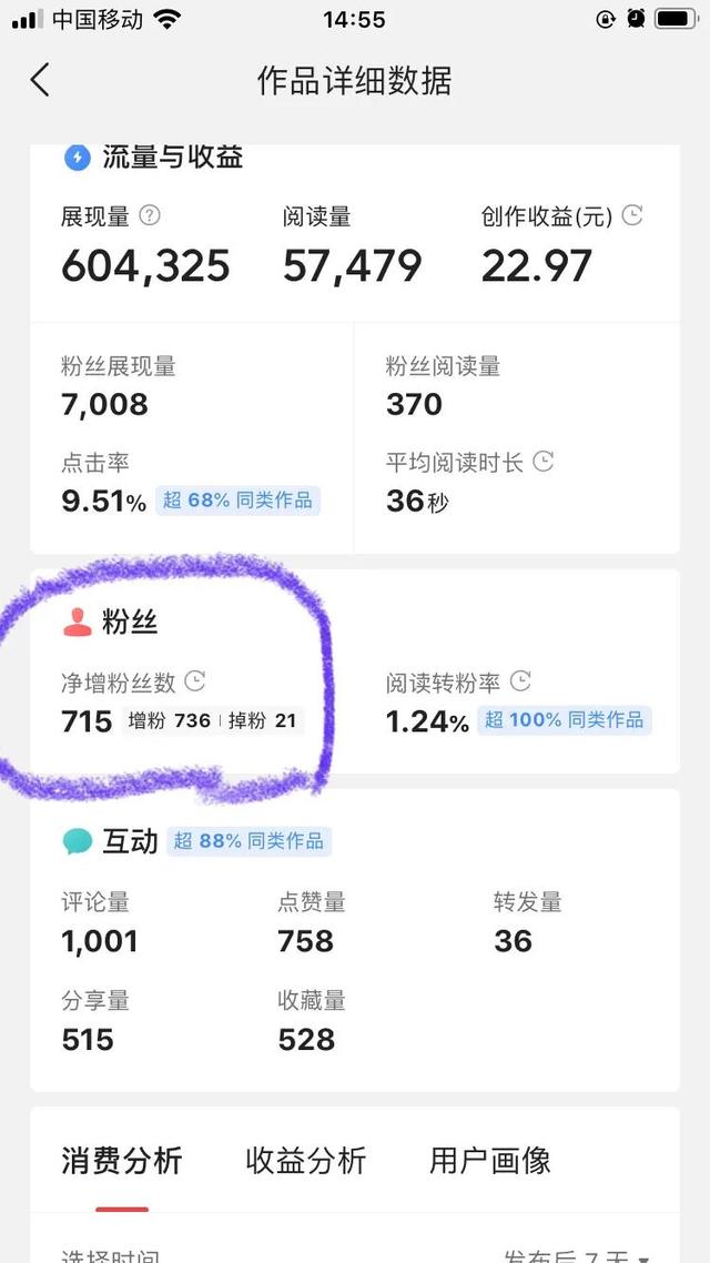 尽管有几篇当时的感觉涨粉不少,细看只有这么一篇[笑哭][笑哭][笑哭]。也是到目前为止收益最高的一篇,40多块钱收益。收益第二的39块多,涨粉很少,只有几个。