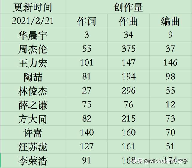 作曲:数量上,周杰伦作曲375首,是整个华语乐团的天花板,没有一位歌手、作曲人的作曲数量能超过周杰伦。