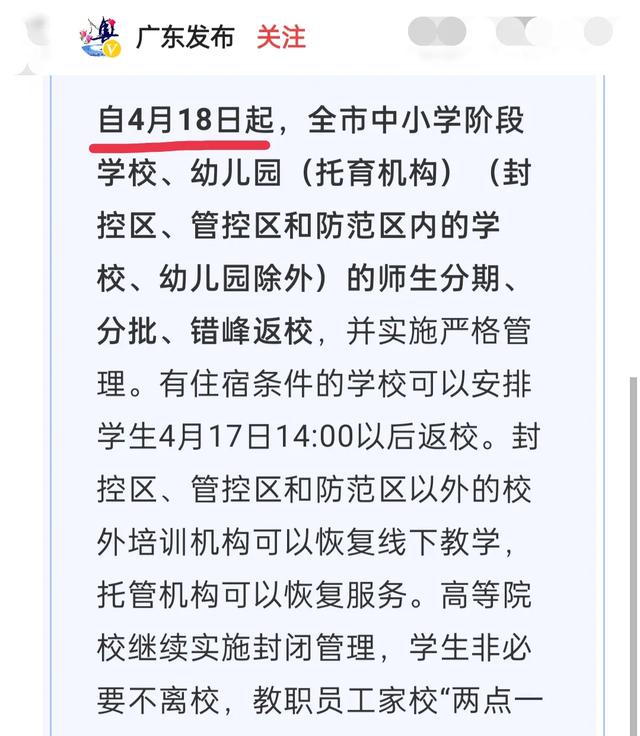 根据“广东发布”发布的信息,佛山自4月18日(星期一)起,全市中小学阶段学校、幼儿园(托育机构)(封控区、管控区和防范区内的学校、幼儿园除外)的师生分期、分批、错峰返校。