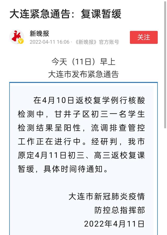 根据“新晚报”4月11日发布的信息,大连紧急通告:复课暂缓。