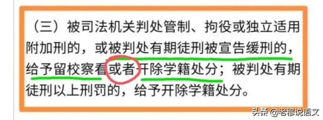 (三)被司法机关判处管制、拘役或独立适用附加刑的,或被判处有期徒刑被宣告缓刑的,给予留校察看或者开除学籍处分;被判处有期徒刑以上刑罚的,给予开除学籍处分。
