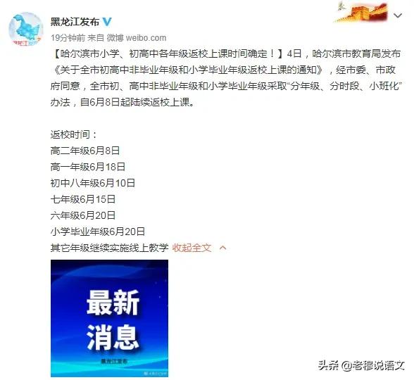 就在昨天,也就是6月4日,哈尔滨市教育局发布《关于全市初高中非毕业年级和小学毕业年级返校上课的通知》,开学时间安排如下: