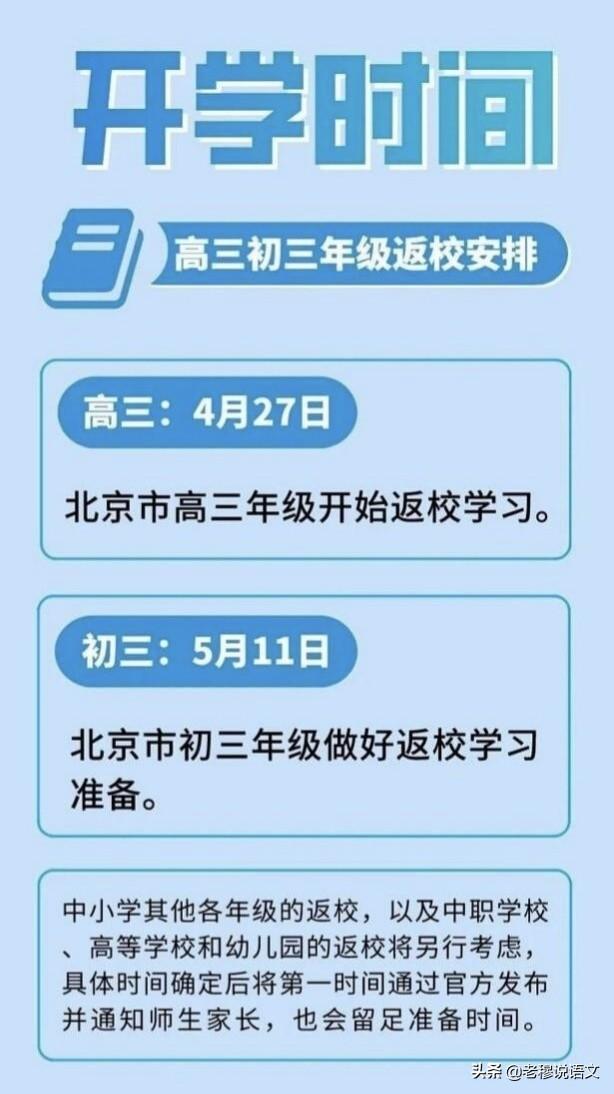 4月12日首都北京官宣开学日期,4月27日高三开学,5月11日后初三开学,其它年级分期、分批依次后推;