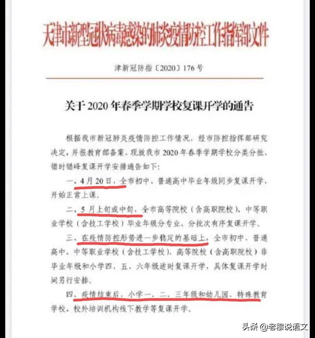 综上所述,老穆猜测,河北的高三和初三,或能与天津一样,在4月20日开学,最迟4月27日。