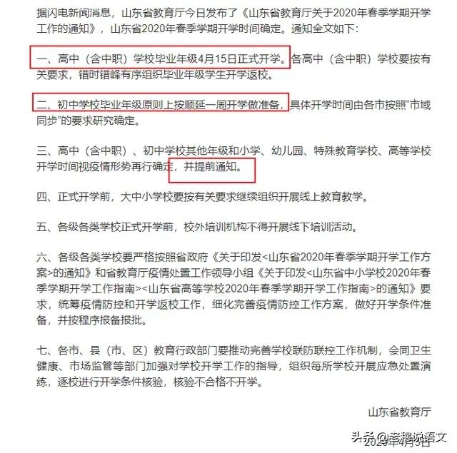 就在刚刚,山东省教育厅发布了2020年春季开学工作的通知,通知规定: