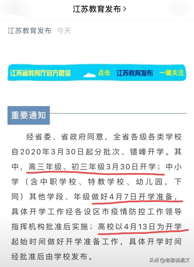 昨天晚上七点左右,老穆收到了头条弹出来的信息,江苏开学啦!
