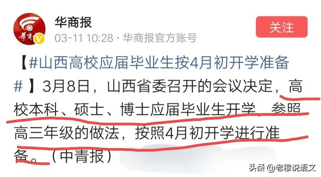 3月10日,山西省决定:高校本、硕、博应届毕业生,按照4月初开学认真进行准备。