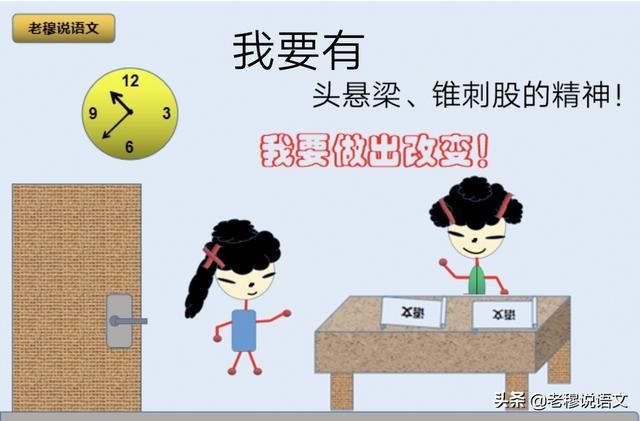 我们来回顾一下故事:头悬梁:故事的主人公汉朝孙敬,年少好学,常常学到后半夜,为了防止自己打瞌睡,于是就想出了把自己头发用绳子拴上,绳子的另一端拴在梁上,一低头打瞌睡就会疼醒,用这样的苦读方式终于功成名就。
