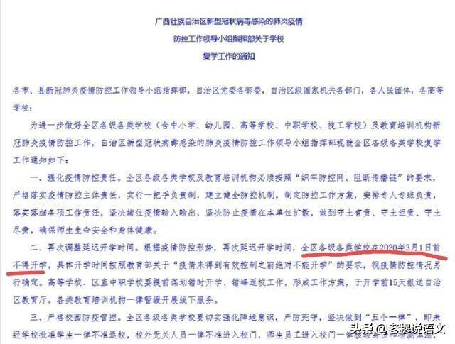 根据疫情防控形势,再次延迟开学时间,全区各级各类学校在2020年3月1日前不得开学……