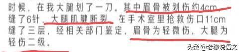 伤口一处在眉骨,伤口长4cm,缝了6针,一处在大腿处,伤口深至肌腱断裂,伤口长11cm,里外缝了三层,此外伤口被鉴定为轻度二级伤残。如今,王某宇已住院90天,但依然不能下地自由行走,每次都要借助轮椅和拐杖,每天插着尿管,经受着缓慢恢复健康的痛苦。