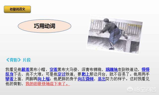 比如朱自清的《背影》,通篇语言都比较质朴,但在“父亲买橘子”片段,作者巧妙地使用了一系列动词,从而让文章出彩,让人过目不忘!