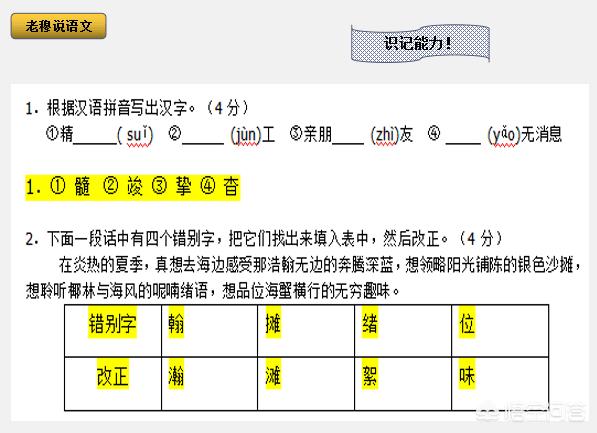其中,识记能力,是可以靠刻苦就能全部掌握的。比如,字音字形、词语成语、名著的识记题、名句名篇默写等,只要你肯花时间去学习,这个部分,是可以得满分的。