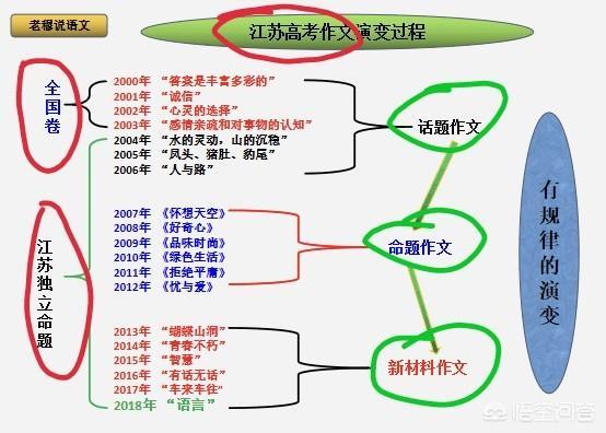 穆老师就拿江苏高考为例,把2000年到2018年所有作文都罗列出来,大家可以很明显地看出“命题趋势”,如下图: