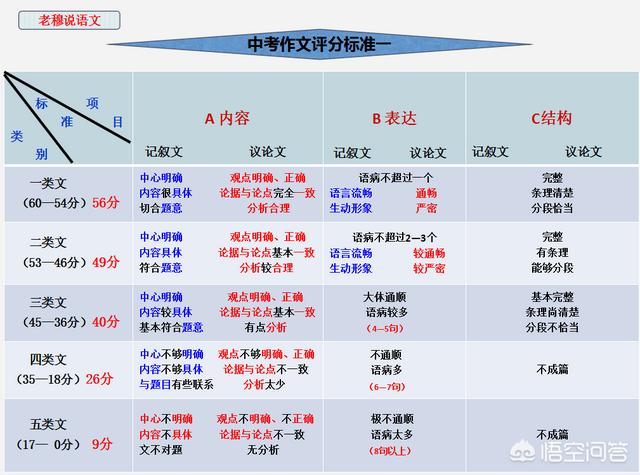 图一:中考作文评分标准一:(绝大部分地区中考采用"标准一")