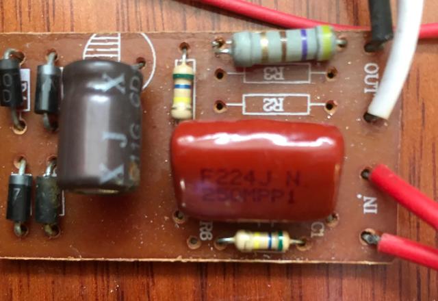 我为了让落地扇只发出无声的微风,就将快档键上串联了一只AC400V2uf的AC电容、电容串联后可用于吊扇的调速,也可用在电烙铁上调温。