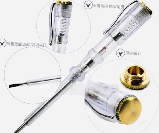 氖泡电笔氖泡电笔的最大特点就是当电笔触碰到带电体的时候,氖泡会发亮,而且笔头就是一把小螺丝刀,应急的时候也可以使用。现在市场上有可拆卸,双批头随意更换的产品,很实用。
