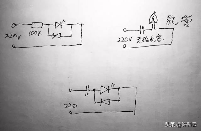 6⃣️还有一种是用日光灯中的氖管,把并联在两脚上的电容(10k档测量指针无动作)断开一脚为串联,直接接入220V,我都是如此废物利用的!