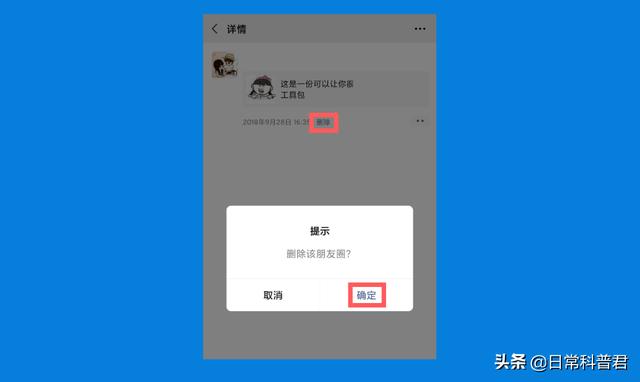进入后,在信息底部找到蓝色“删除”字体,点击并确认删除,这样就可以把自己发送到朋友圈的信息删除了: