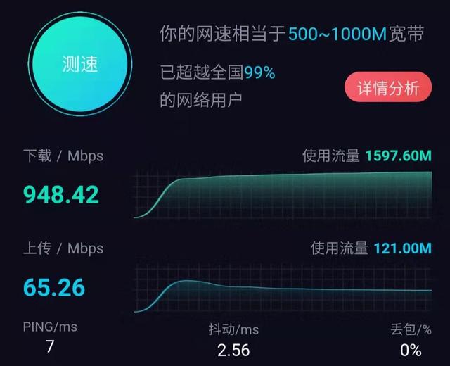 卧室1与卧室2虽然没有网线与路由,但是也能是可以跑满千兆的,如下就是我的测速图。如果你将主路由放在电视机那里,卧室3速度应该会有所下降,但是跑满500m是完全没有问题的