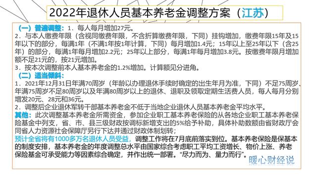 比如说,2022年的江苏省退休人员基本养老金调整方案,主要是针对2021年12月31日前年满70周岁以上的老人,根据年龄段不同,每人每月额外增加基本养老金20元、28元、36元。