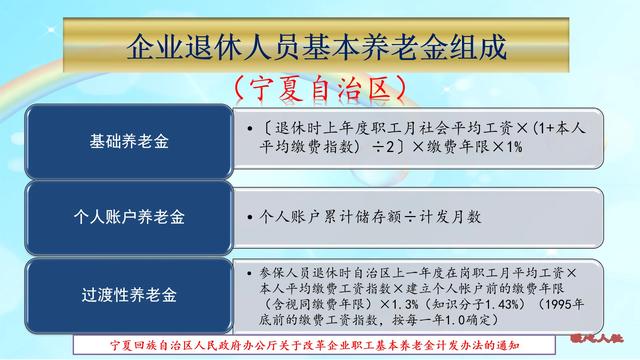 宁夏自治区的养老金计算公式是这样的:基础养老金和个人账户养老金计算公式是全国统一的,过渡性养老金计算公式是自己制定的。