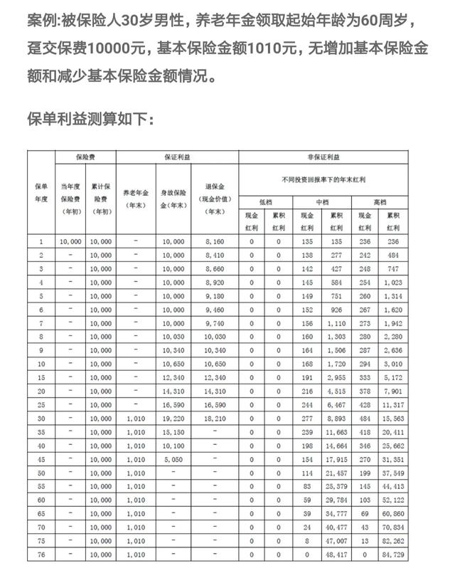 支付宝中有一种全民养老金,30岁时一次性缴纳1万元,60岁才每年领取1010元,第一年的现金价值只有81.6%。现金价值指的是个人退保时能够退回的钱数。