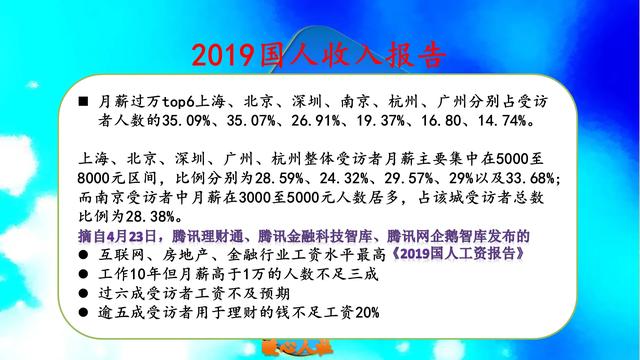 根据某鹅发布的《2019国人收入报告》,调查显示月薪过万的人群在上海、北京、深圳、南京、杭州、广州最高。上海、北京的有关比例分别达到了35.09%和35.07%。如果我们居住的地方是发达的一二线城市,经常听到人们说收入过万也是正常。