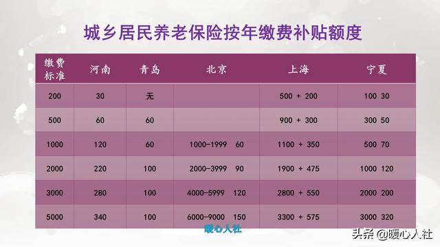 为了鼓励大家缴费,国家还专门设置了参保补贴,最低不低于30元。也就是说,按照100元档次缴费,国家还要补贴30元。各个地方还可以进行额外的补贴,比如说河南省按照5000元档次缴费,政府补贴340元;上海市按照3300元档次缴费,政府补贴575元;宁夏按照3000元档次缴费,政府补贴320元;青岛市按照1500元以上档次缴费,政府补贴100元。