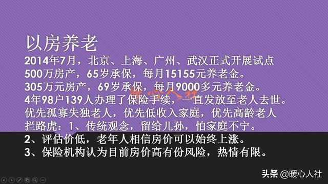 以房养老,是2014年7月开始国家推动的养老新模式。通过将房子抵押给保险公司的方式,由保险公司发给养老金。如果房子不是自住房,老人还可以再租出去,赚另外一笔租金收入。不过,由于传统思想都是把财产留给子女,以房养老的政策虽然叫好,但并不叫座。